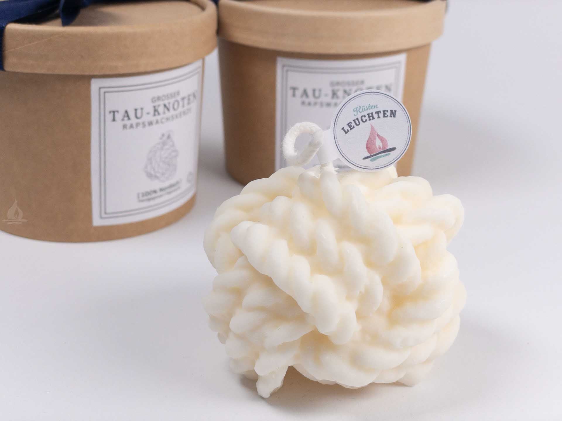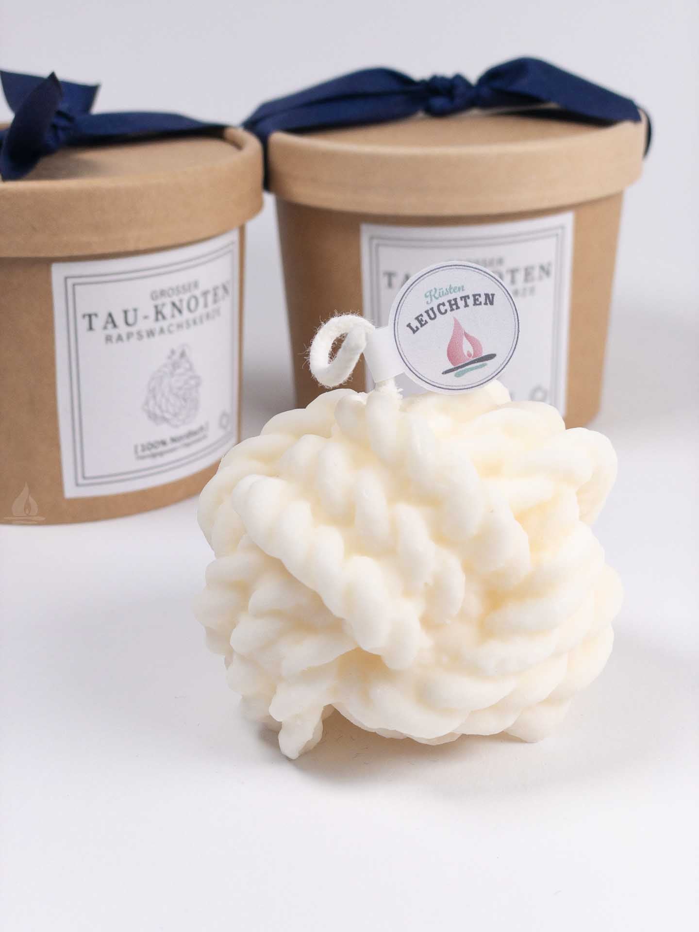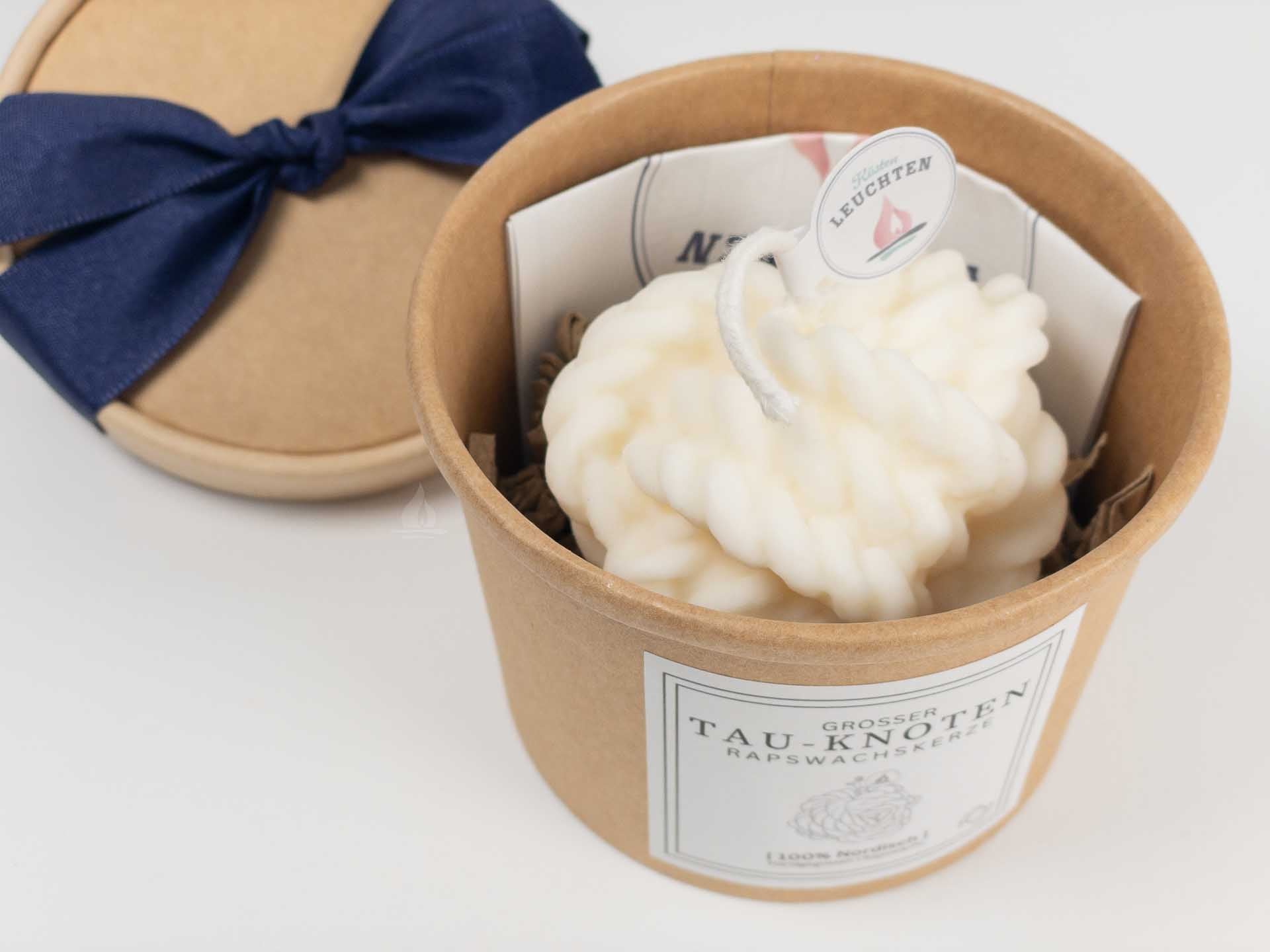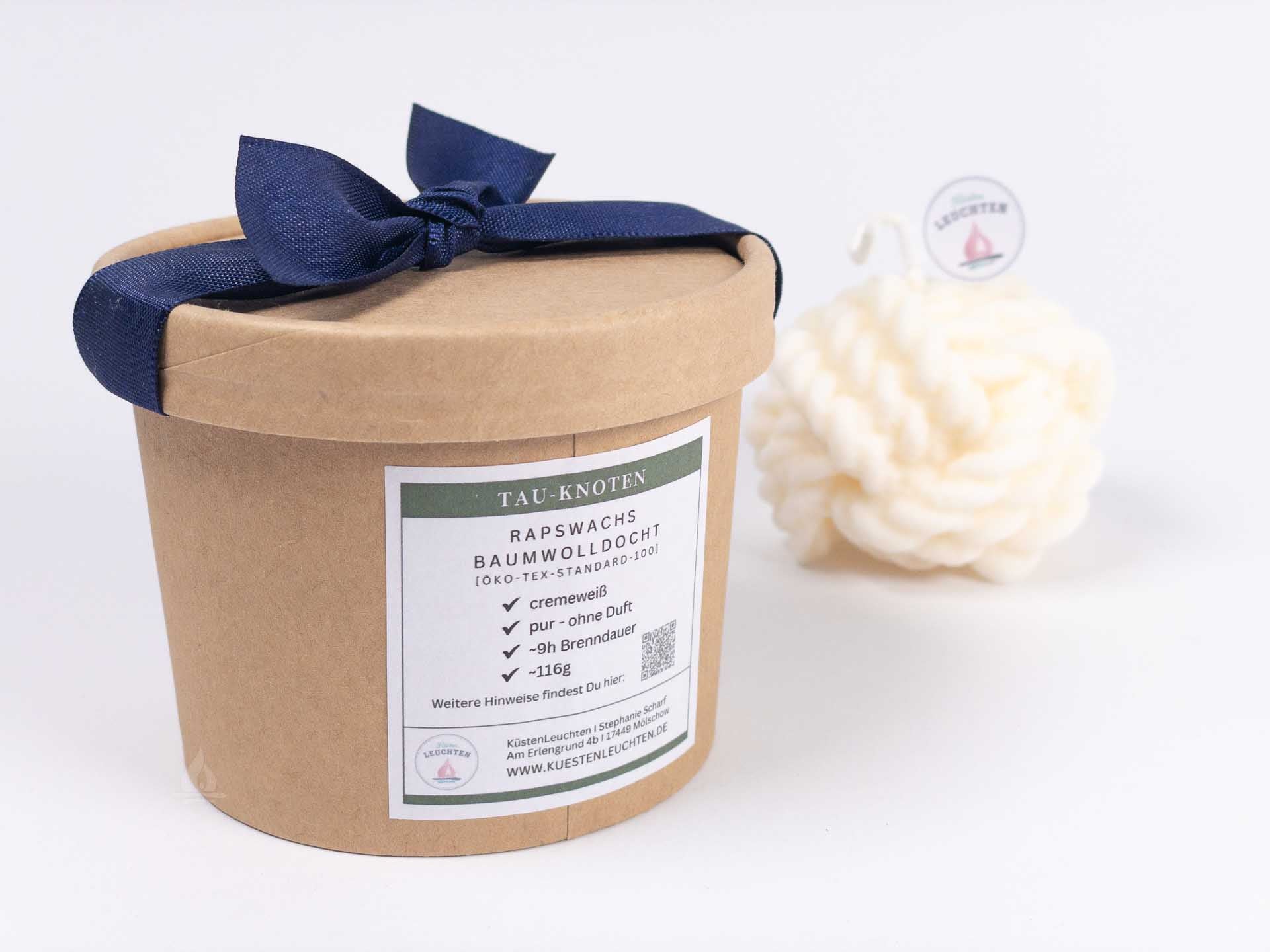 Der große Tau-Knoten kommt zum Verschenken bereit in schöner Verpackung bei Dir an. Ein maritimer Hingucker, der an handgefertigte Seemannsknoten erinnert. Ob als stilvolles Dekorationsstück oder als Geschenk für Freunde und Familie. Die Tau-Knoten-Kerze ist das besondere Geschenk für alle, die das maritime Leben lieben.